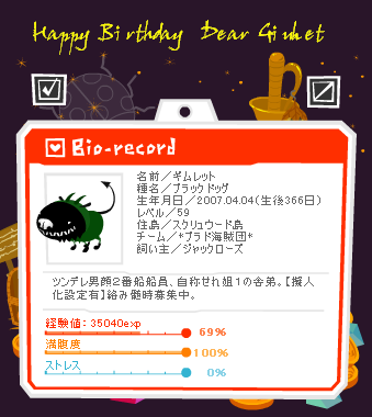 タイトルどうり… 見事に復活に毒されました。 え?遅いって…?! バッキャヤロー これからですぜ><(何だコイツ 何かテンションがおかしいです。 今日一日中お昼ねしないで、復活見たせいか…(寝ろよ。) そして、おでん小説書きたかったのに 書けなかったorz それも、全部復活のせいですn(お前のせいだろ。) いや、その前にもっと重要な事が… 宿題やってない><(お、まえっ あ、でも最初の授業だから いいです。諦めますよ← え?二匹の誕生日? そんなの知るか 極限だ(最低だな。) と、いうのは嘘で…続きにて お誕生日画像をちゃーんとUPしてますよv← と言うか、リボーンのアニメ突っ込みどころまんさいで困り果てました← コレも続きにてうるさいぐらい語ってます。 それでは この辺で…。 おめでとうっ! これからも馬鹿い主をヨロシクおねげーいたしますっ ちなみに、ギムレットは本名ですがルヴィんとこは英語で「へたれ」 って書いてます。この子はドコまででもヘタレでいいと思います。 さて、ココから復活感想。文句受け付けません(オイ と、とりあえずね… ハイパーな綱吉ってエロくないですか? あれ、押し倒してほしいですっ 主に骸様に← え?ゴクツナ?聞こえナーイ(調子いいなお前) と、いうか…実のところすっごい迷っているんです。 ゴクツナか、ムツツナかで…(どうでもいいな) でもな…えEDの獄寺キュンの髪結んでるところに折れちゃいそうです キュンキュンだぜこのやろう>< まあ エロはムク様担当でほのぼのはごっくん担当にしましょうかね。 と、いうかですよ…私復活の中で1、2位を争うぐらい ビアンキ姉貴が大好きなんです…! 何ですか、あの人… かっこよすぎじゃないですか?! 真のヒロインは髑髏ちゃんかビアンキ姐さんだと 思うんだなっ(何 てってか 髑髏ちゃんね…! 最初は ん? って思ってましたが ヤバイ、かわいすぎる><(ビアンキには及びませんが!) とりあえず、触手と頬を赤らめるのだめっ あ、と腹チラっ! 理由:かわいすぎるから。 犬×髑髏 ってすっごい萌えると思いますよっ NCPは普通に好きだったりします。 いえなかったけど ゼロしい大好きですよ^p^(うわぁ 沖神 も…v とまあ 熱く語ったので今日はこの辺で!掲示板の返信もしなくてわっ でわでわ>< PR COMMENTS